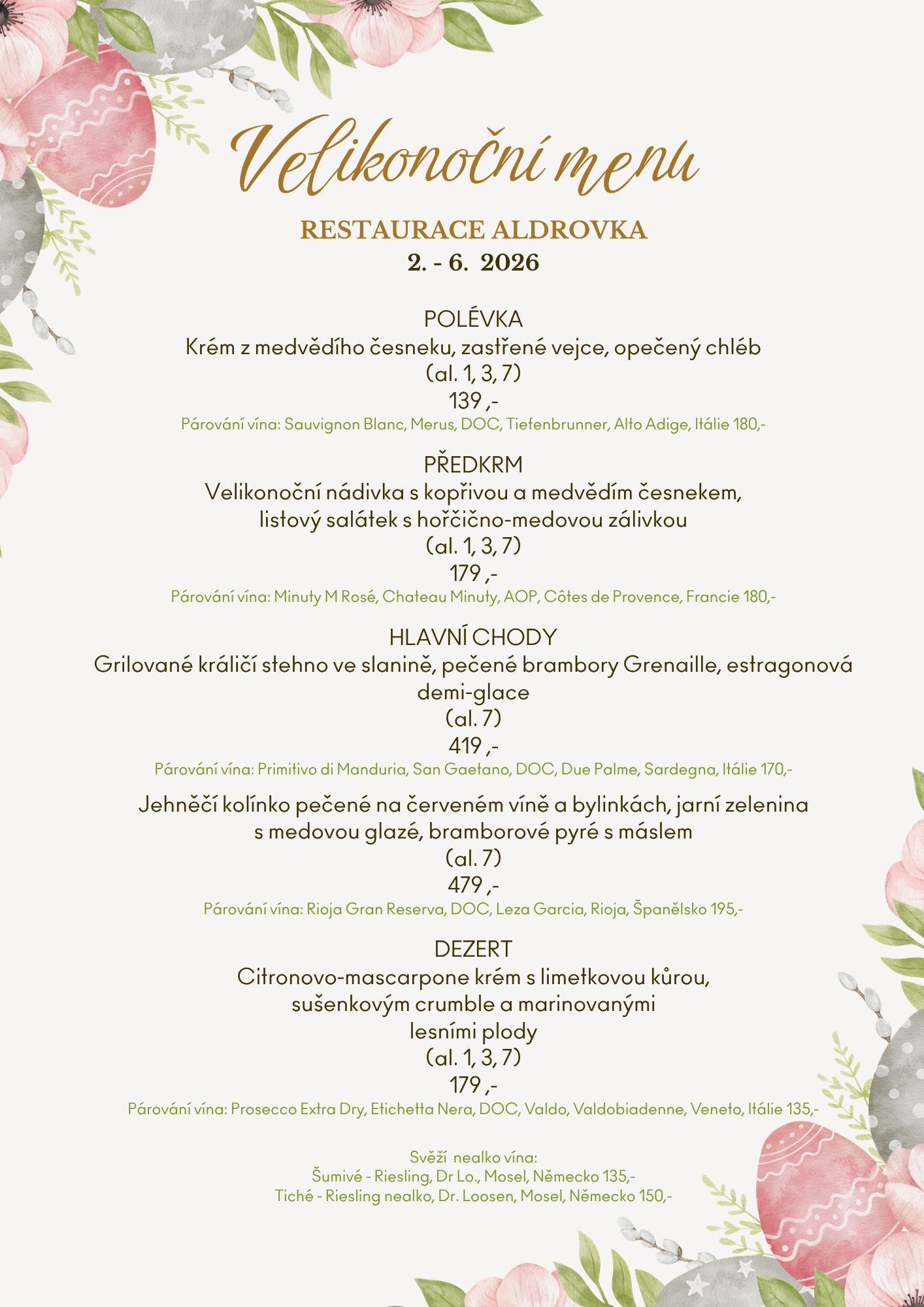 nabídne gurmánský velikonoční zážitek – od krému z medvědího česneku se zastřeným vejcem přes velikonoční nádivku s kopřivou a medvědím česnekem až po grilované králičí stehno ve slanině či jehněčí kolínko pečené na červeném víně s bylinkovou jarní zeleninou. Na závěr vás potěší citronovo-mascarpone krém s limetkovou kůrou a marinovanými lesními plody. Každý chod doplňuje pečlivě vybrané vinné párování – od jihotyrolského Sauvignon Blanc přes provensálské Minuty M Rosé a italské Primitivo di Manduria až po španělskou Rioja Gran Reserva.