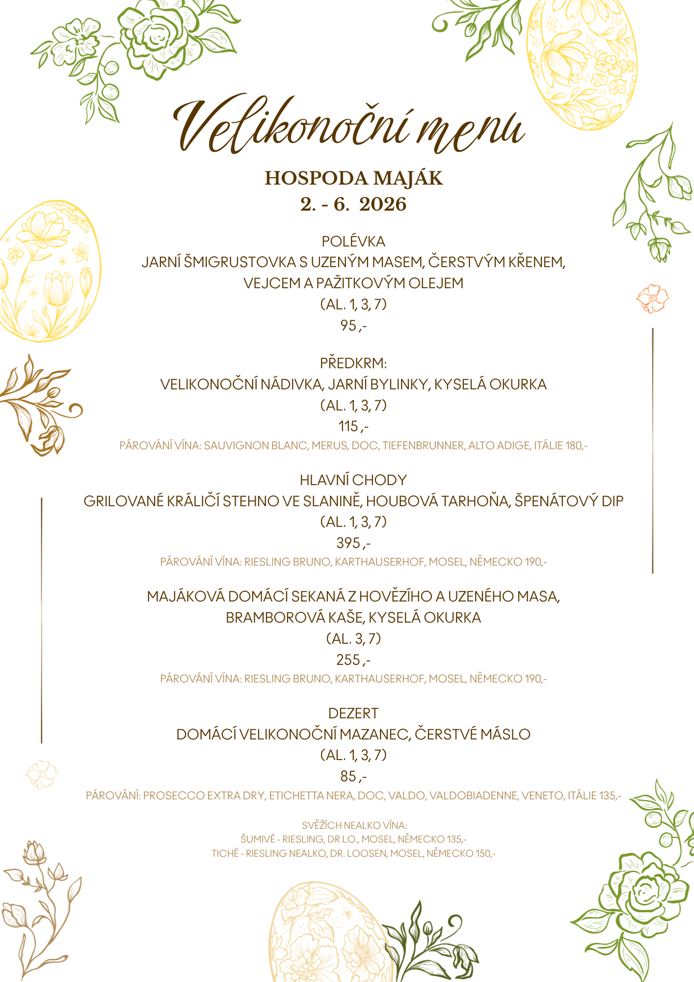 vsadí na tradiční velikonoční klasiku s krkonošským nádechem – jarní šmigrustovku s uzeným masem a čerstvým křenem, velikonoční nádivku s jarními bylinkami, majákovou domácí sekanou z hovězího a uzeného masa s bramborovou kaší nebo grilované králičí stehno s houbovou tarhoňou a špenátovým dipem. Sladkou tečkou bude domácí velikonoční mazanec s čerstvým máslem. K jídlu si můžete vychutnat německý Riesling Bruno z Moselu nebo si připít sklenkou Prosecca Extra Dry z italského Valdobbiadenne. K dispozici jsou i svěží nealko vína od Dr. Loosen.