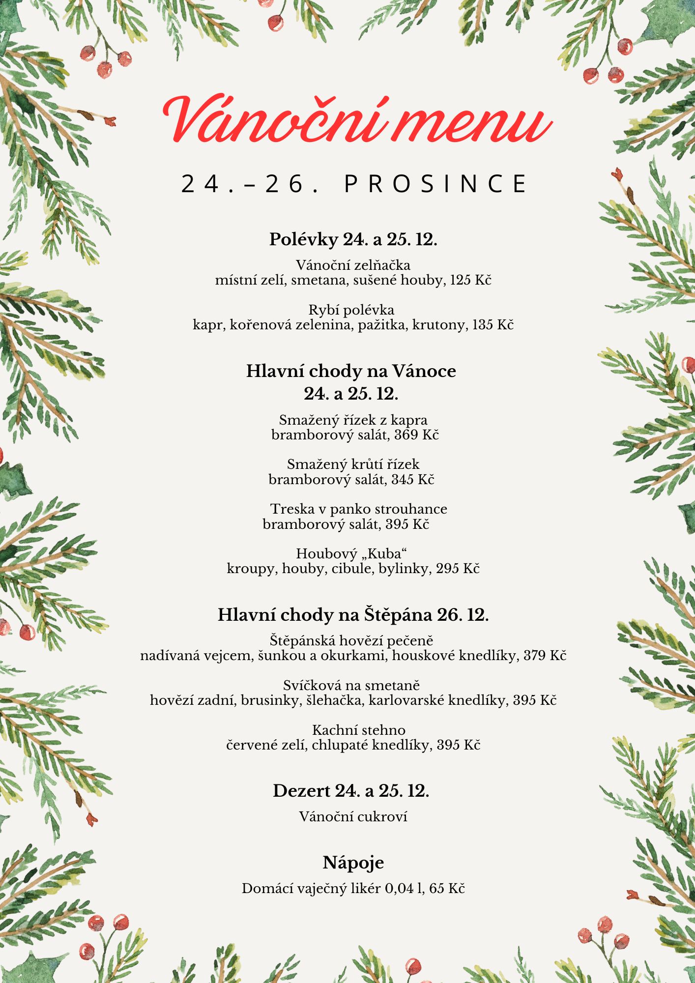 Od 24. do 26. prosince vám nabídneme pečlivě sestavené vánoční menu plné osvědčených klasických chutí i jemných moderních úprav.
